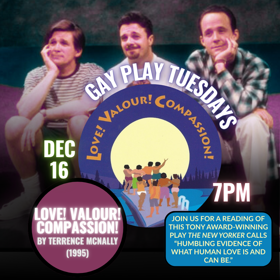Join us for our next installment of Gay Play Tuesdays on December 16th at 7pm, when we will read Love! Valour! Compassion! by Terrence McNally (1995).